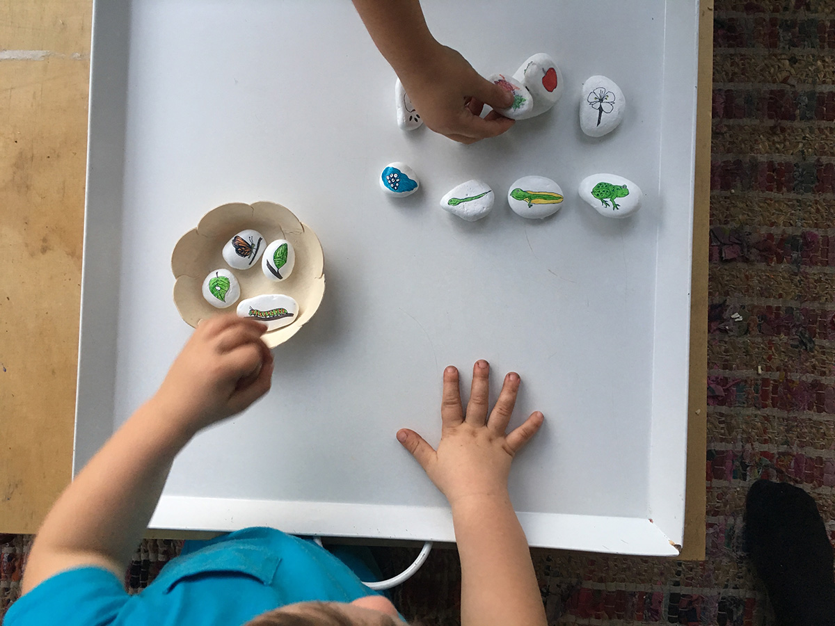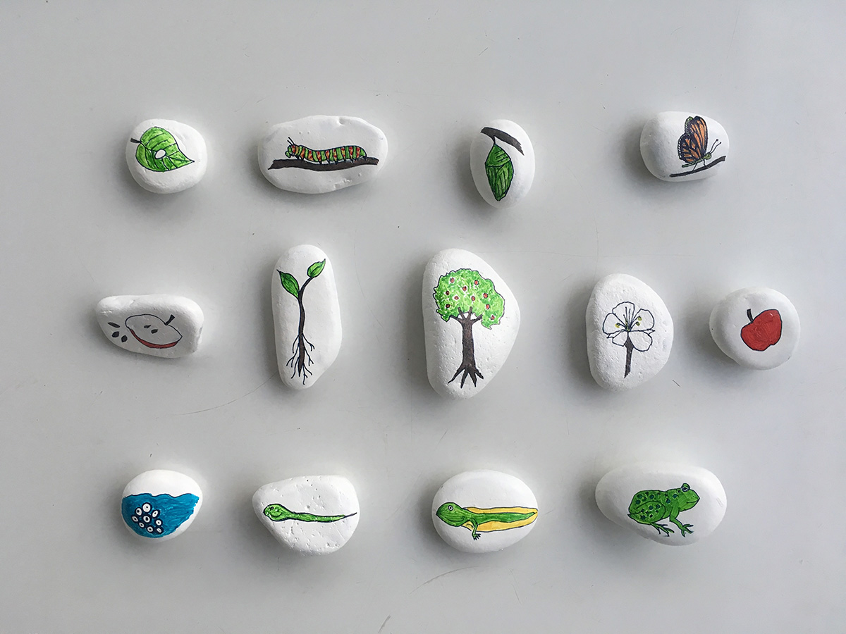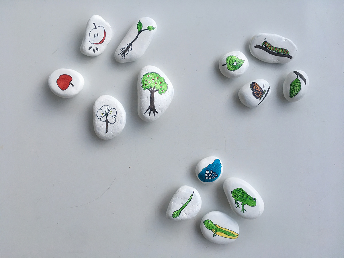 Primero pintan las piedras de color blanco y una vez que estén secas dibujan y pintan sobre ellas. Apoyamos la actividad con un libro sobre los ciclos de vida que me gusta mucho se llama “Which came first?”.