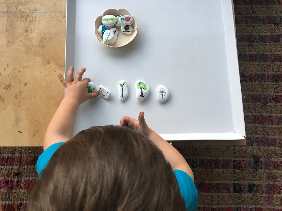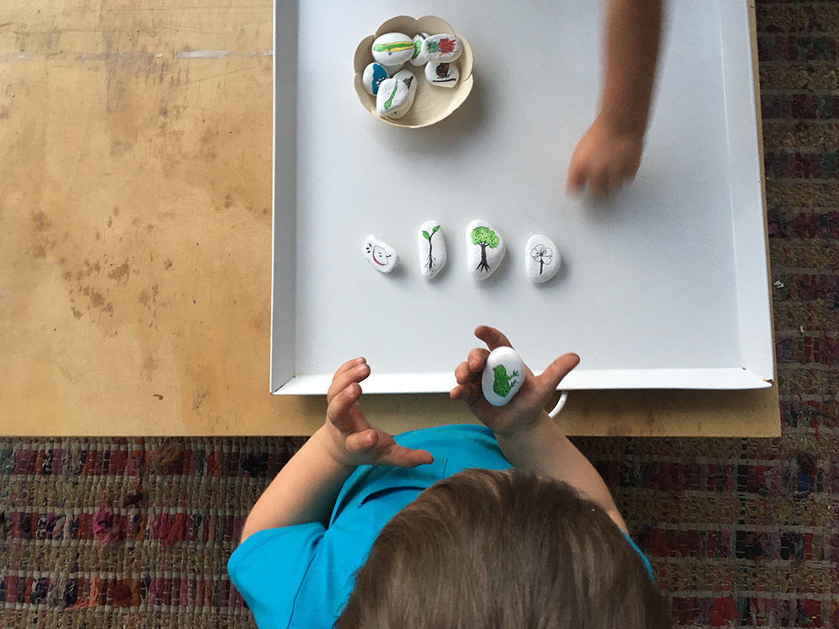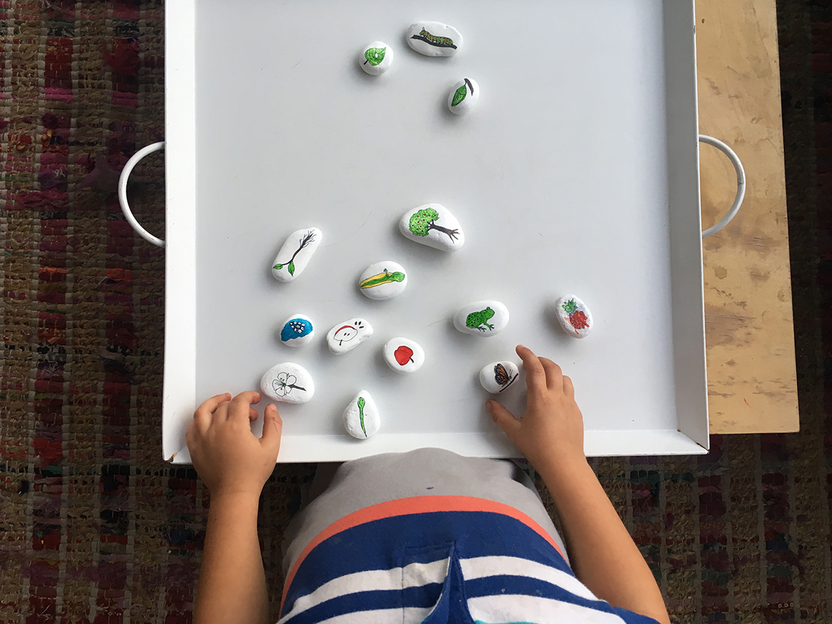 Primero pintan las piedras de color blanco y una vez que estén secas dibujan y pintan sobre ellas. Apoyamos la actividad con un libro sobre los ciclos de vida que me gusta mucho se llama “Which came first?”.