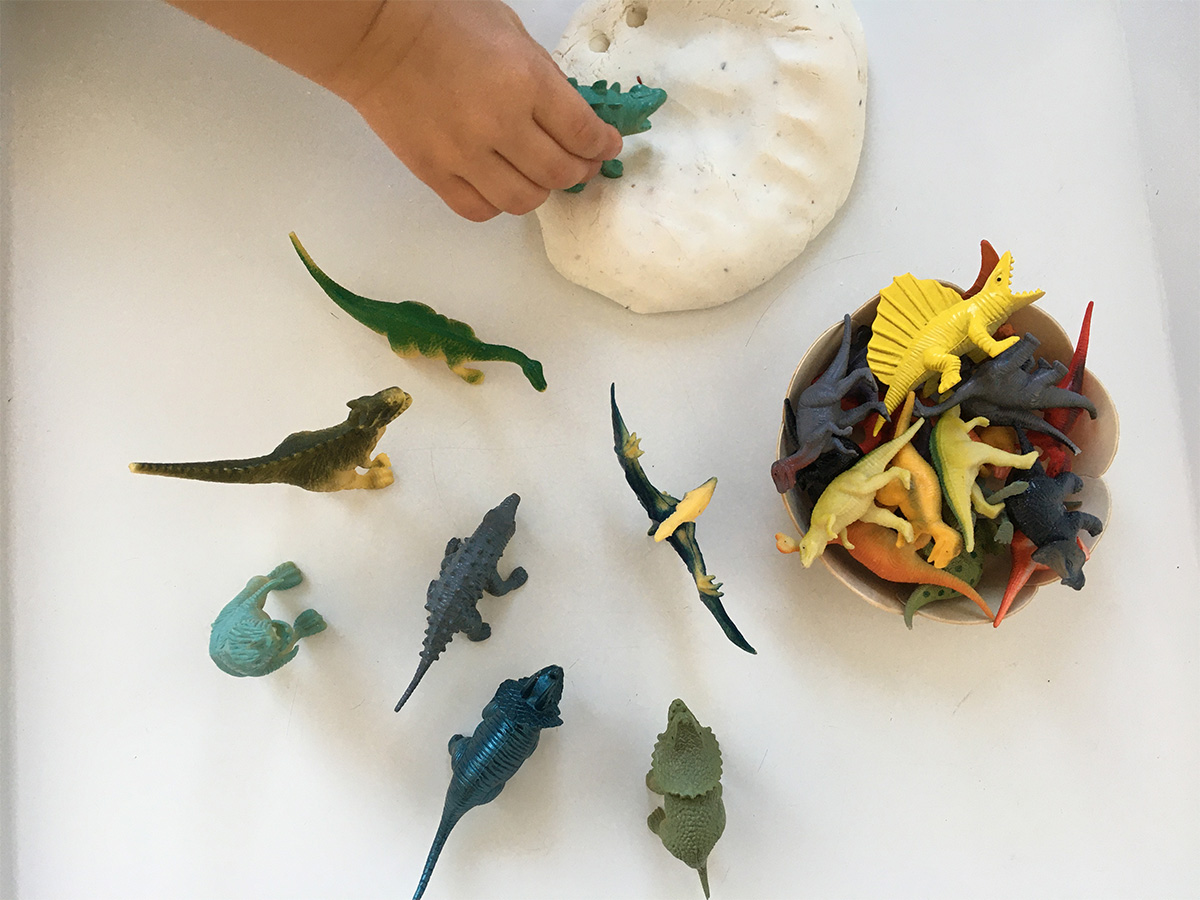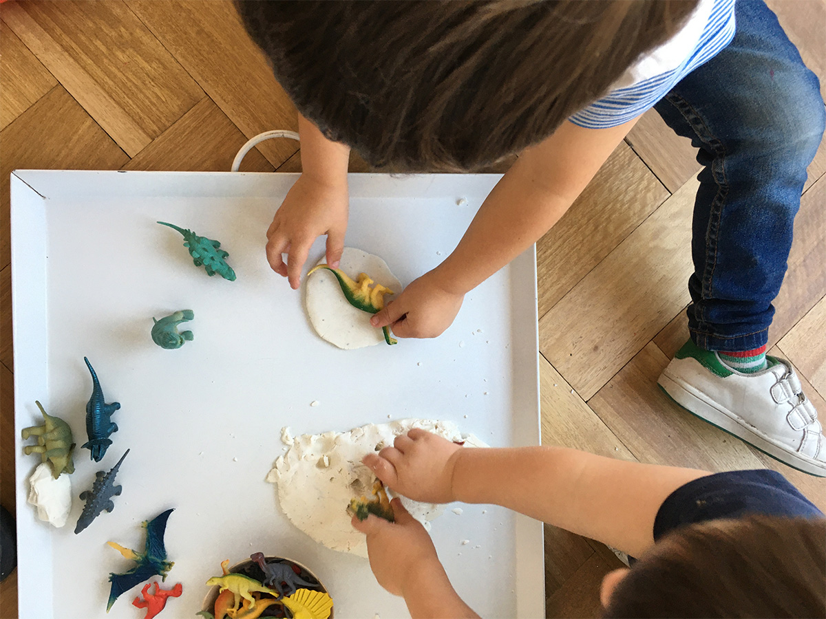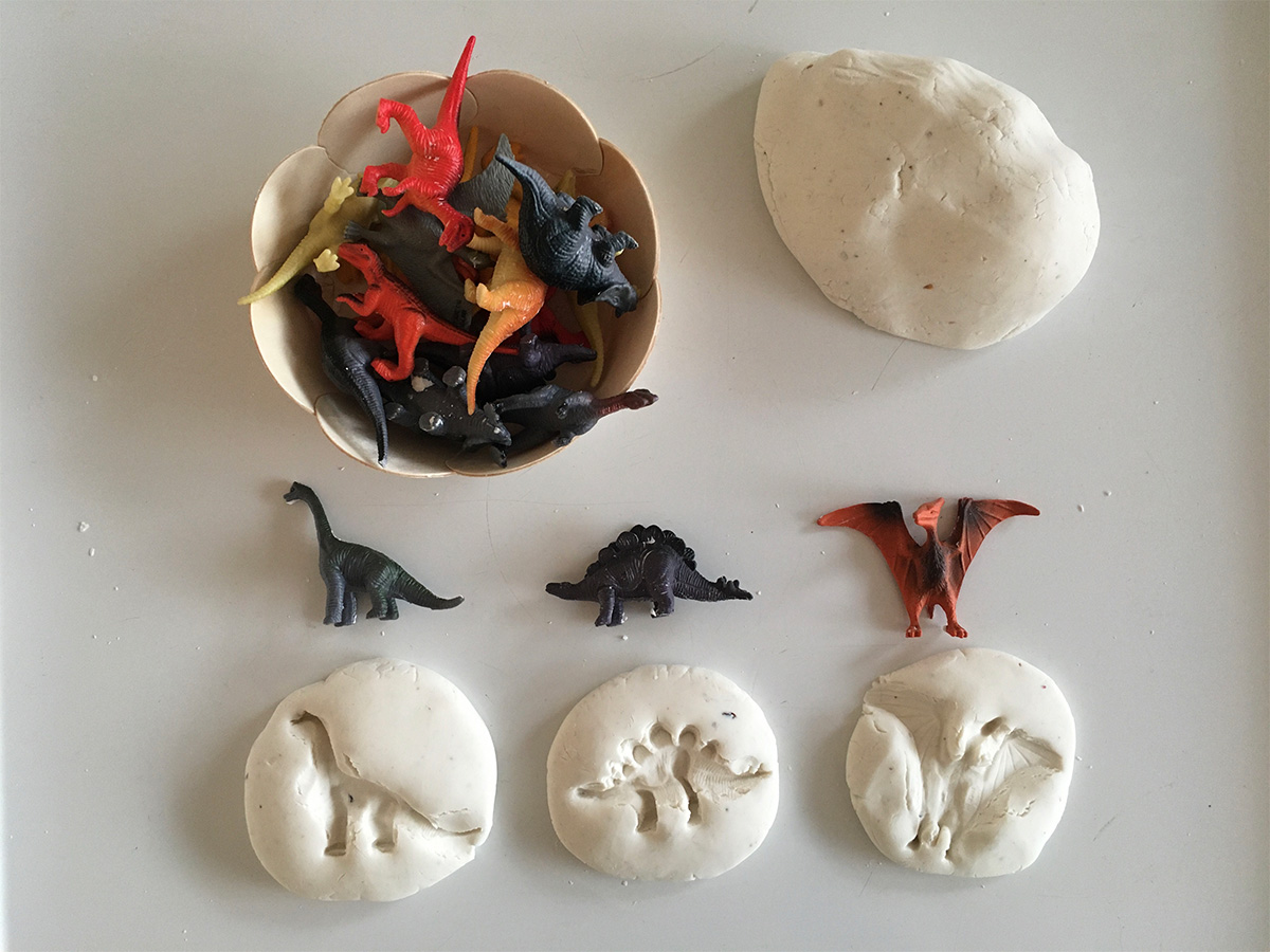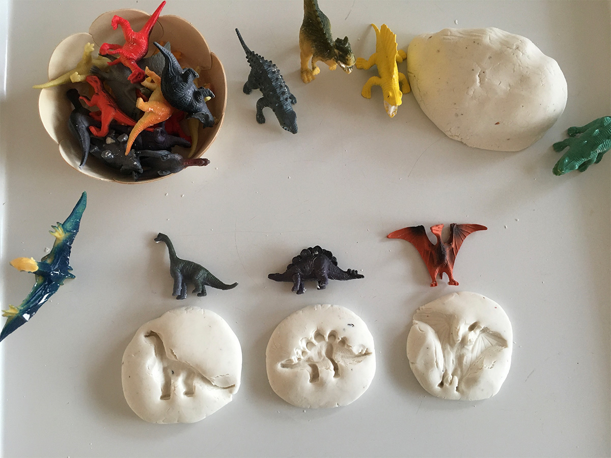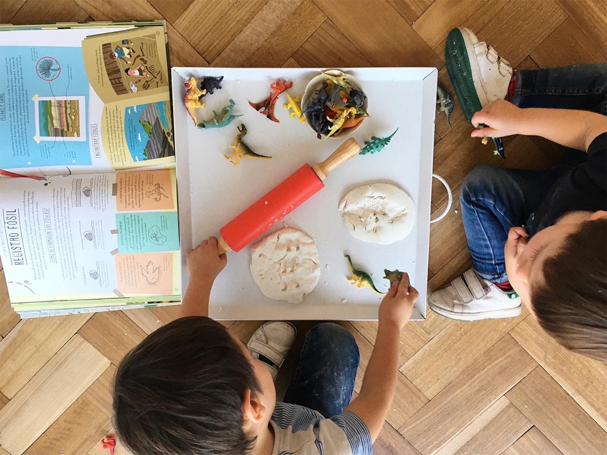Estuvieron mucho rato jugando a crear fósiles de dinosaurios, yo les hablé sobre los fósiles y leímos lo que salía en el libro.