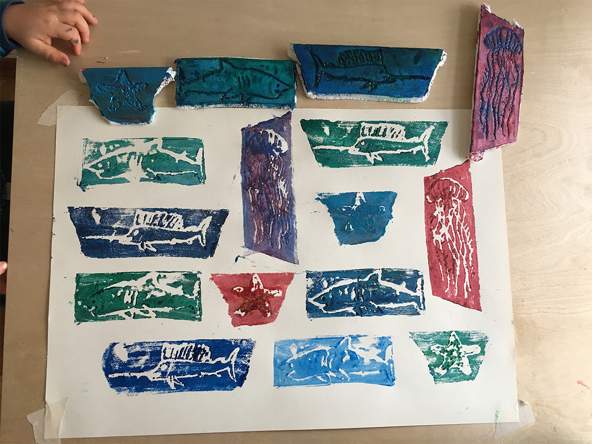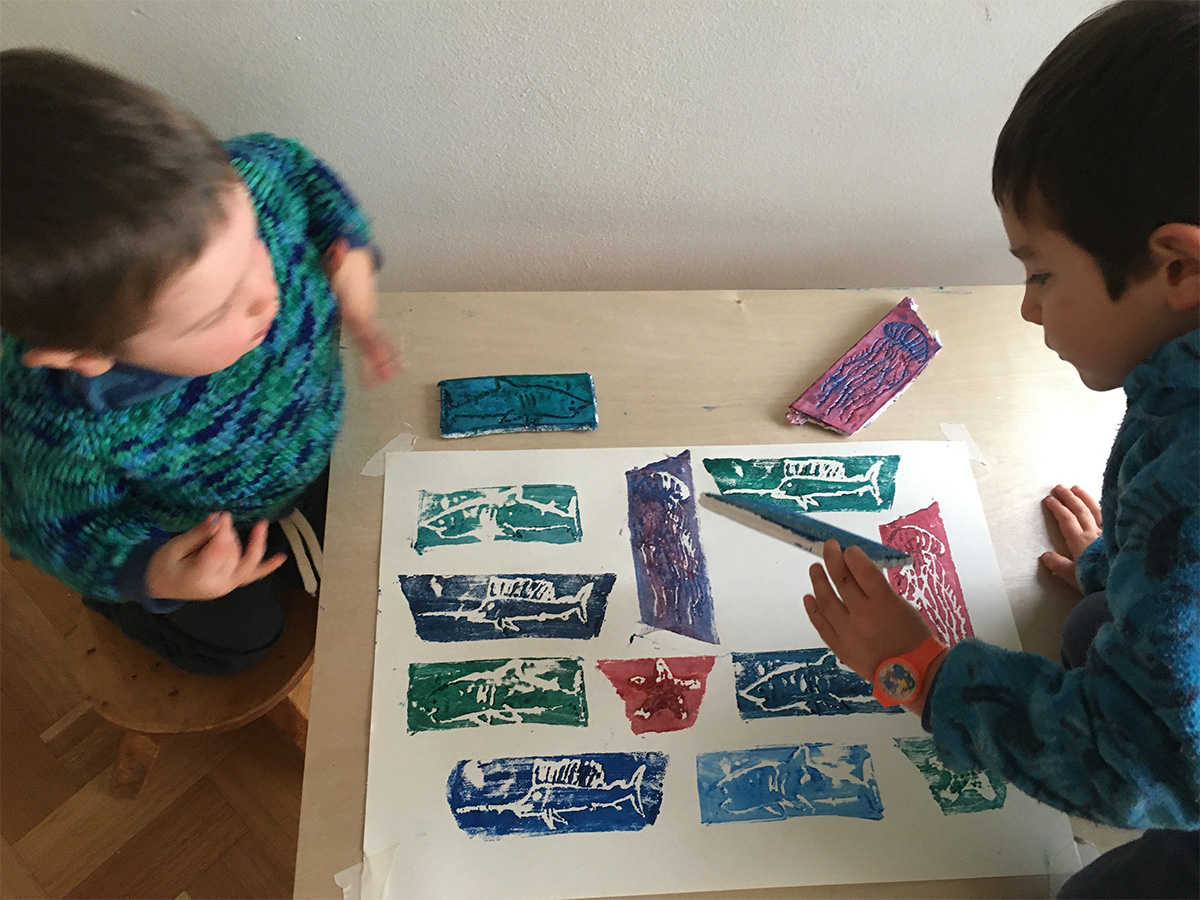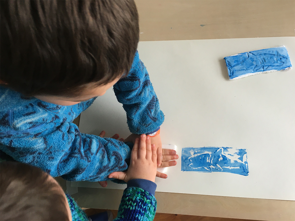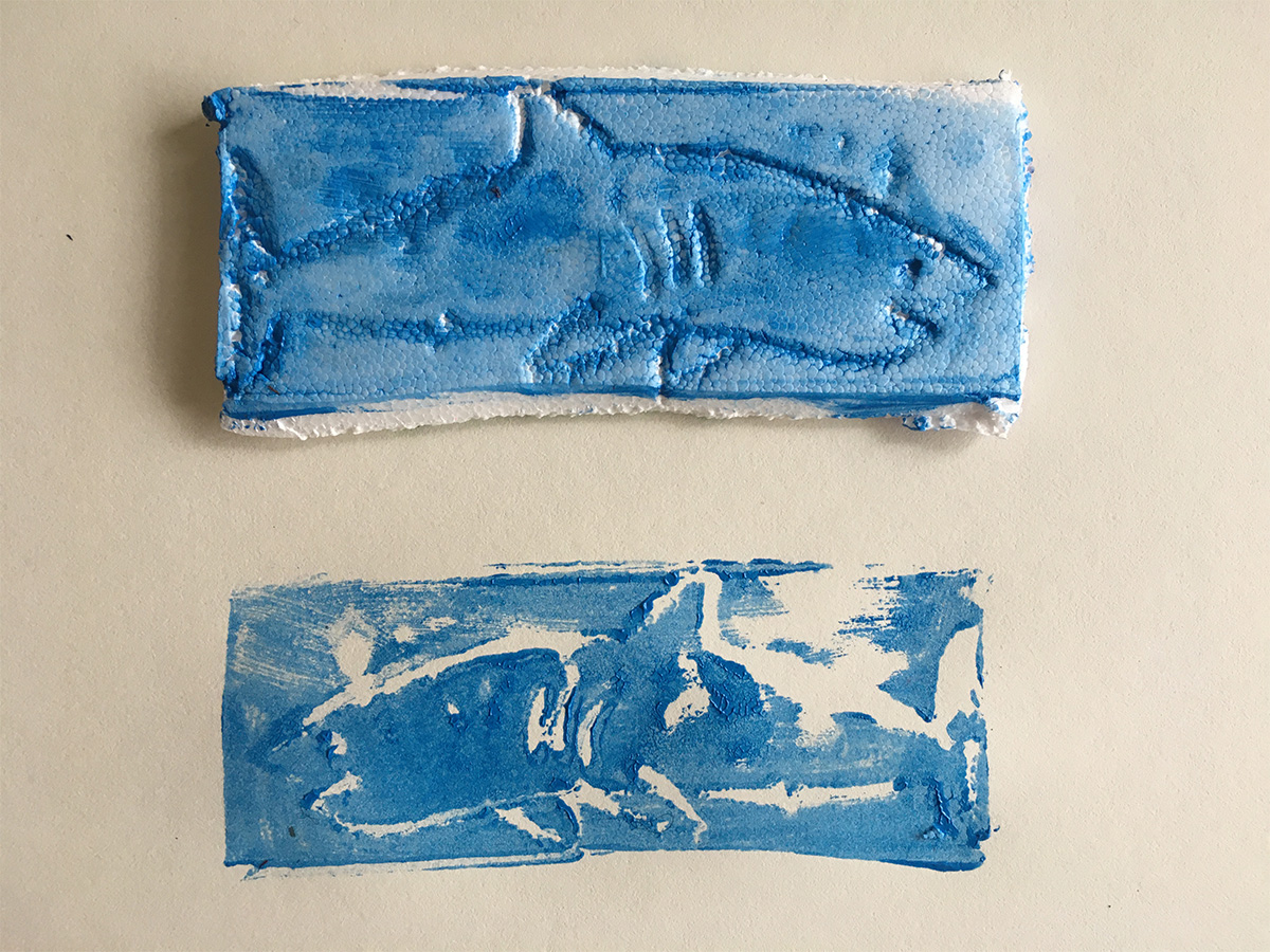 Cortamos una cassata de helado para crear nuestras matrices, dónde dibujamos (con un lápiz mina), luego le echamos pintura (ocupamos acrílicos), y para finalizar transferimos esa imagen presionando sobre el papel o puede ser sobre tela también. Este paso de pintar sobre la matriz hasta transferir, tiene que ser rápido si utilizan acrílicos ya que se seca en poco tiempo.