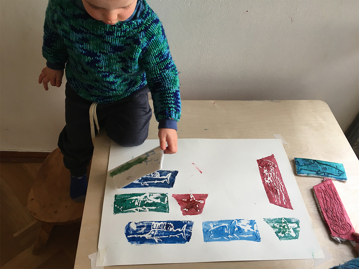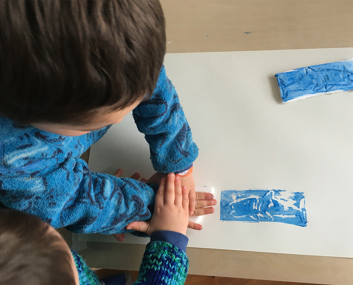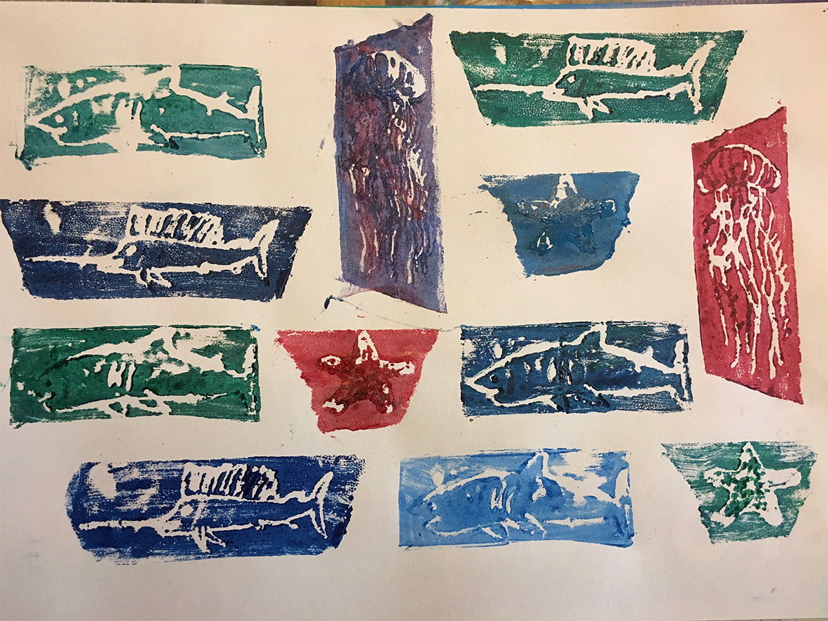 Cortamos una cassata de helado para crear nuestras matrices, dónde dibujamos (con un lápiz mina), luego le echamos pintura (ocupamos acrílicos), y para finalizar transferimos esa imagen presionando sobre el papel o puede ser sobre tela también. Este paso de pintar sobre la matriz hasta transferir, tiene que ser rápido si utilizan acrílicos ya que se seca en poco tiempo.