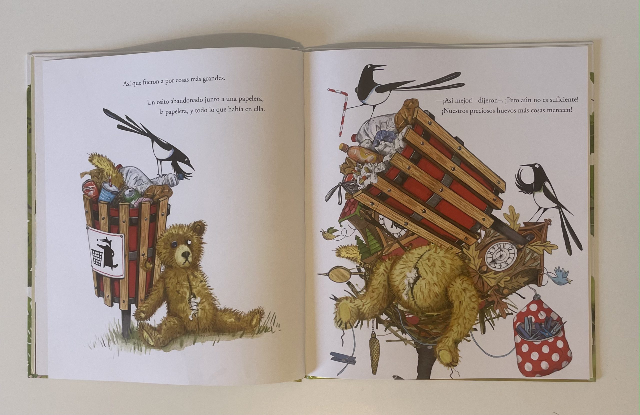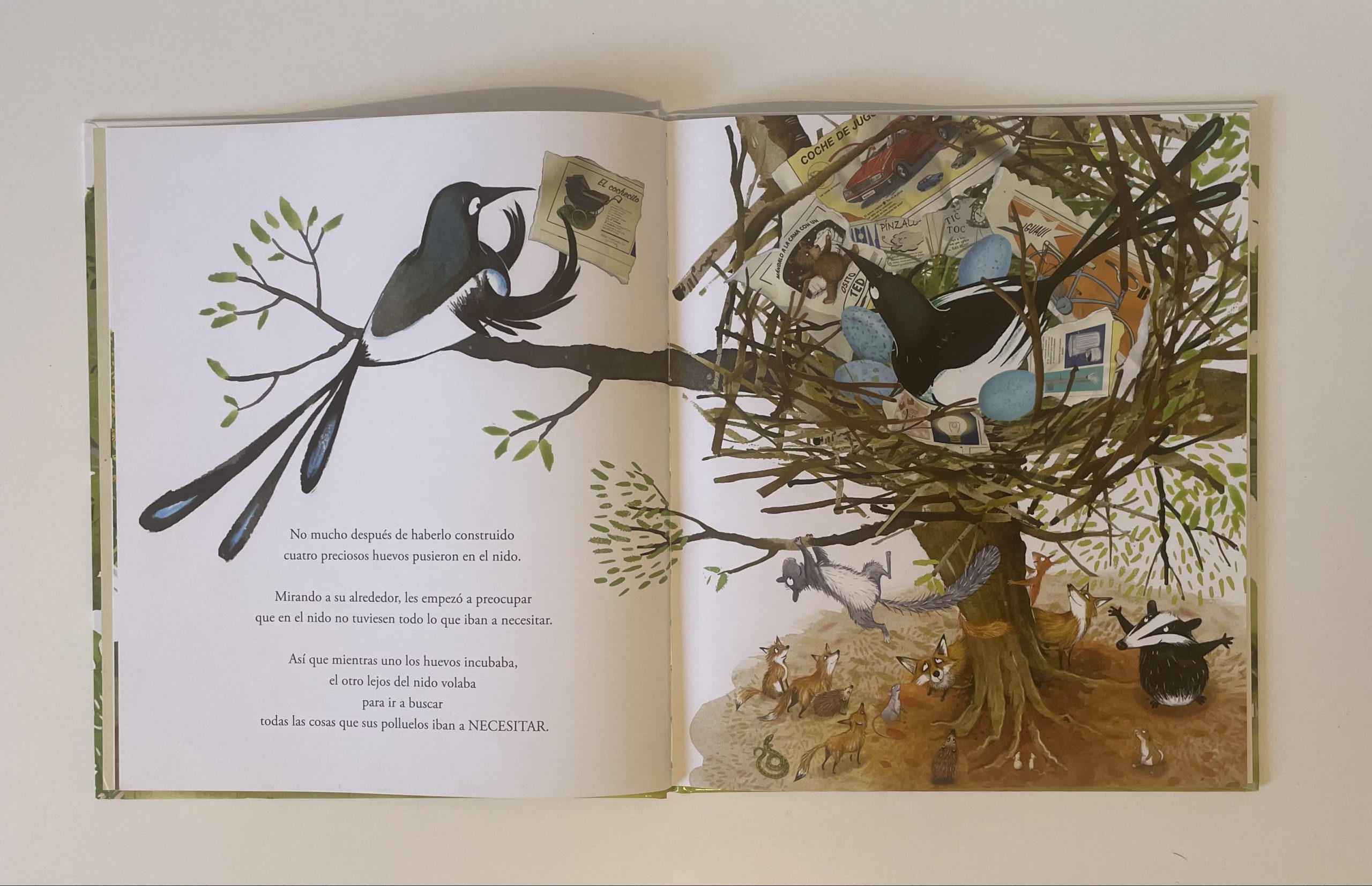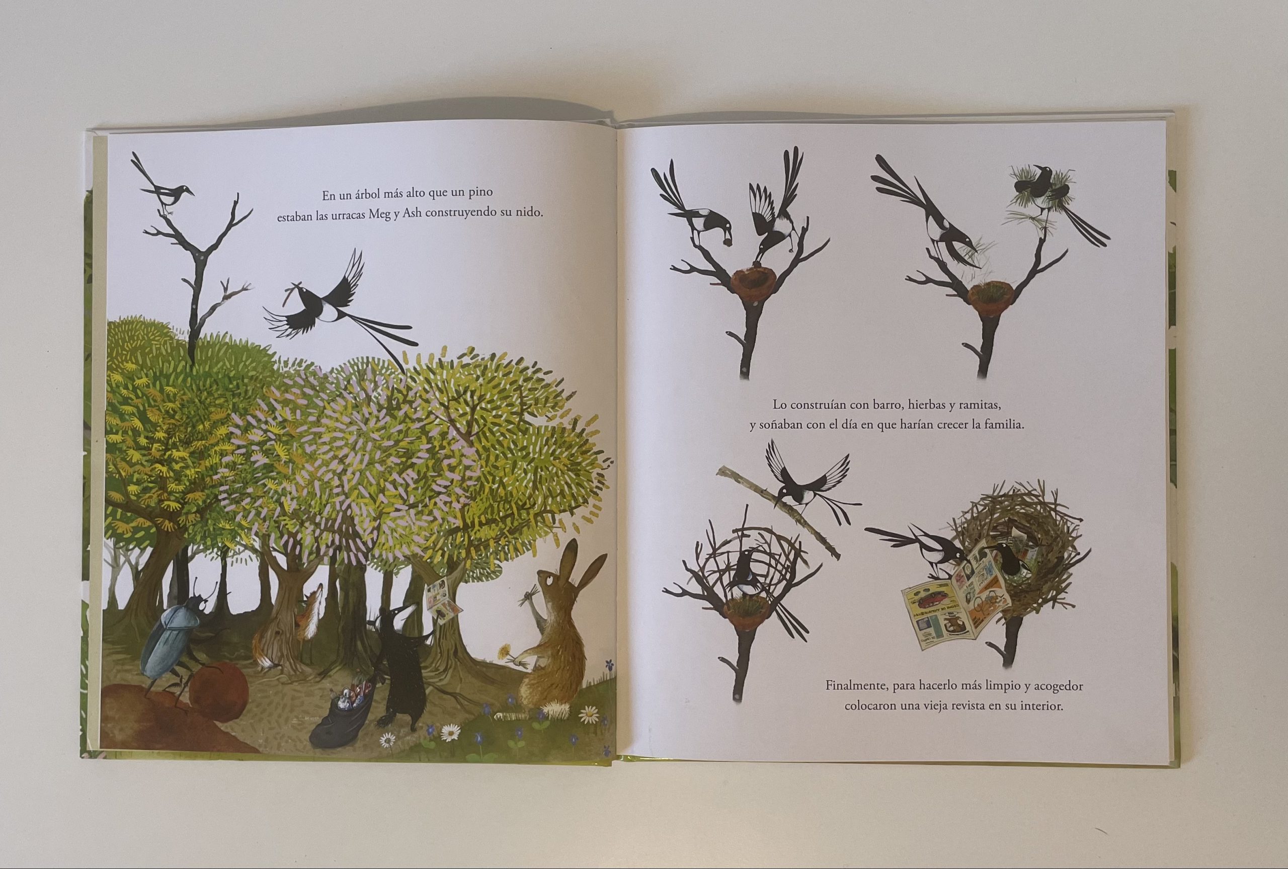 Ash y Meg son dos urracas que acaban de construir el nido en el que vivirán con los cuatro pollitos que esperan. Mientras incuban los huevos, se preguntan si ya tienen todo lo que van a necesitar sus urraquitas cuando nazcan, pero no. ¡Todo es poco para sus pequeñines! Así que empiezan a llenar el nido con cosas y más cosas y más cosas, hasta que…. mejor no les contaré el final.
