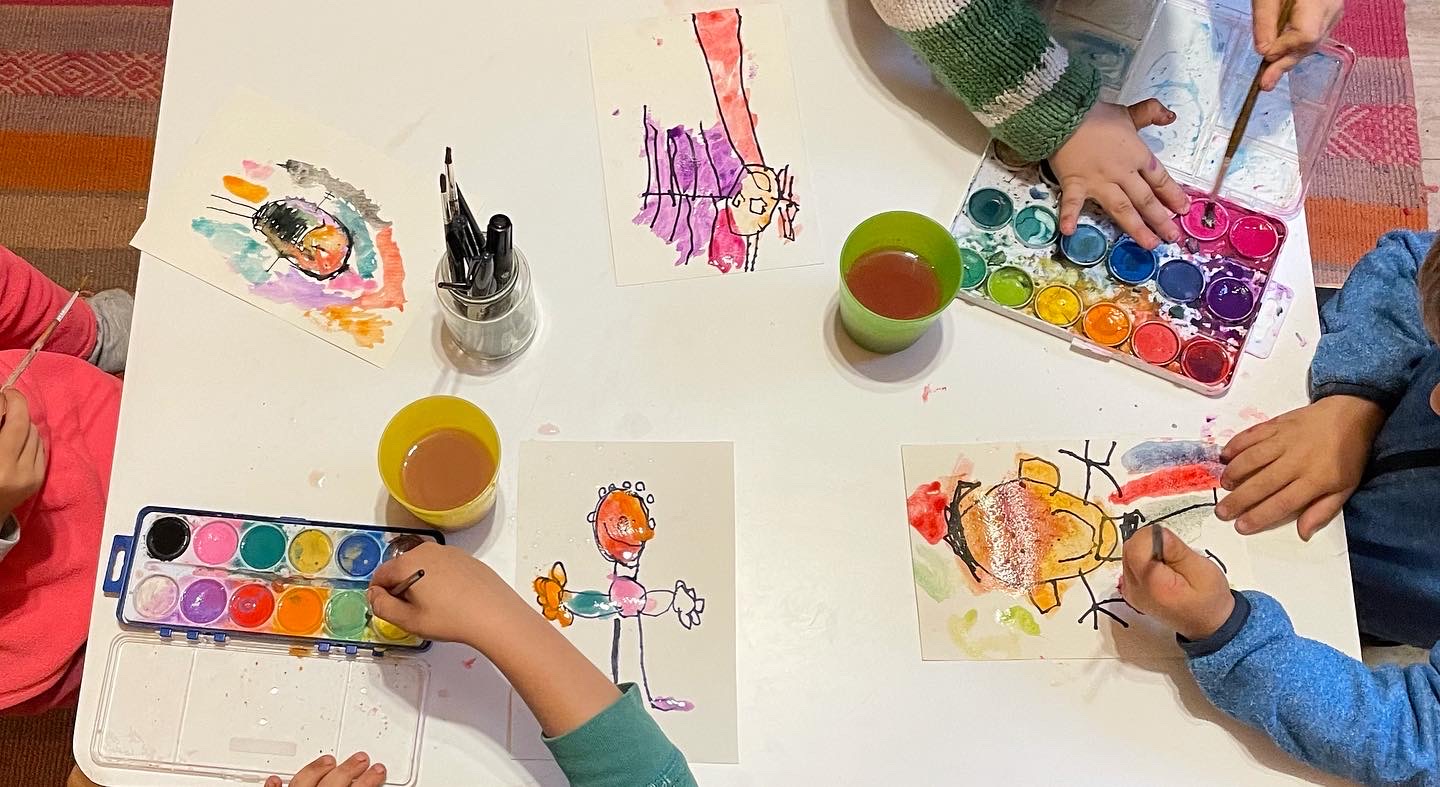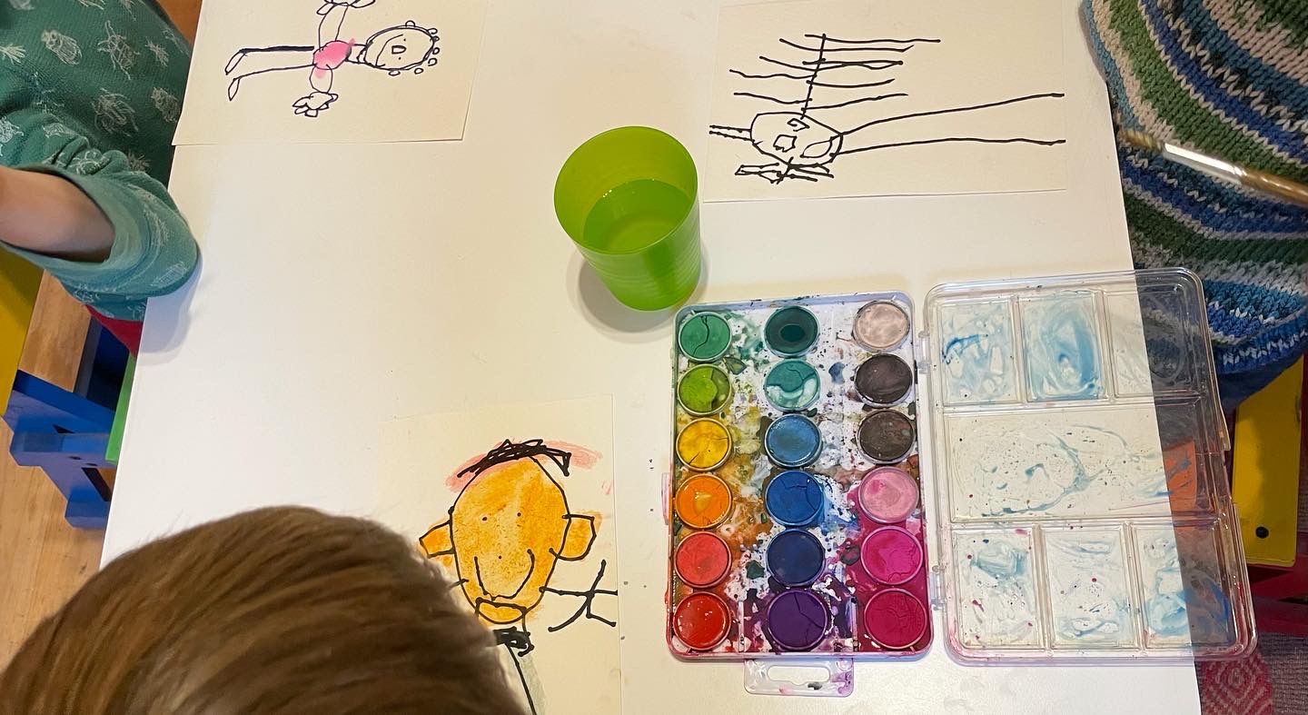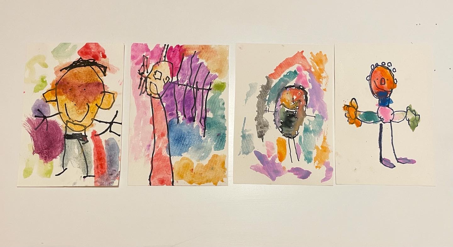 Después los invité a retratar a su amigo/a que estaba al lado, primero dibujando con plumón negro y luego pintando el dibujo con acuarelas de colores (sobre un buen papel para acuarela).