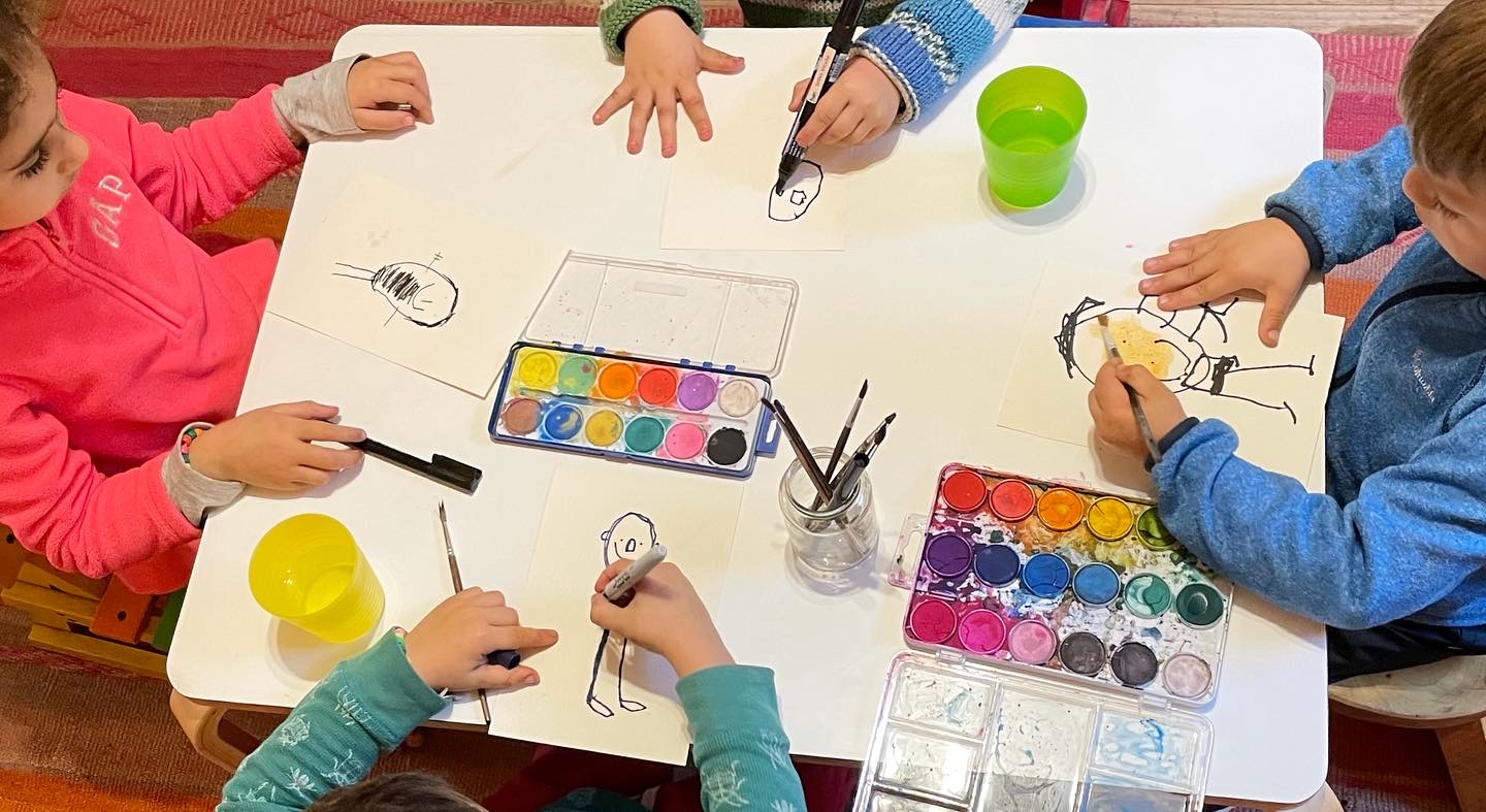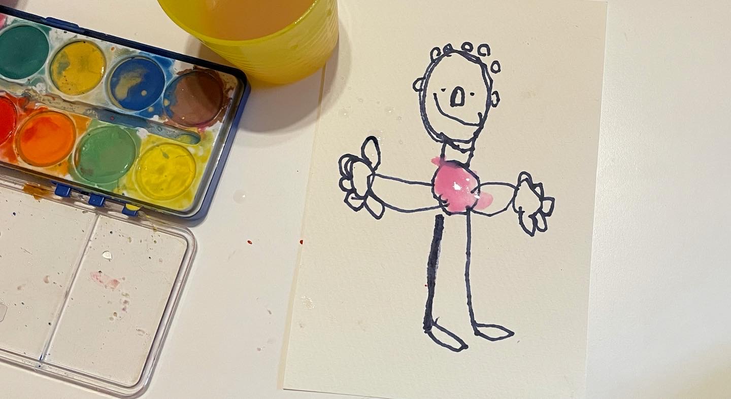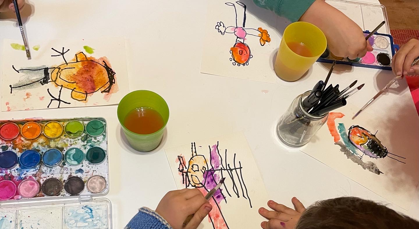Después los invité a retratar a su amigo/a que estaba al lado, primero dibujando con plumón negro y luego pintando el dibujo con acuarelas de colores (sobre un buen papel para acuarela).