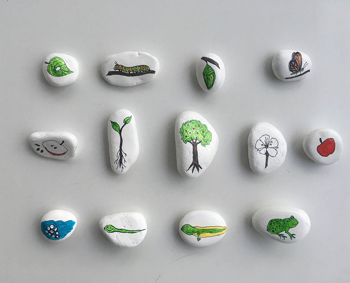 Primero pintan las piedras de color blanco y una vez que estén secas dibujan y pintan sobre ellas. Apoyamos la actividad con un libro sobre los ciclos de vida que me gusta mucho se llama “Which came first?”.