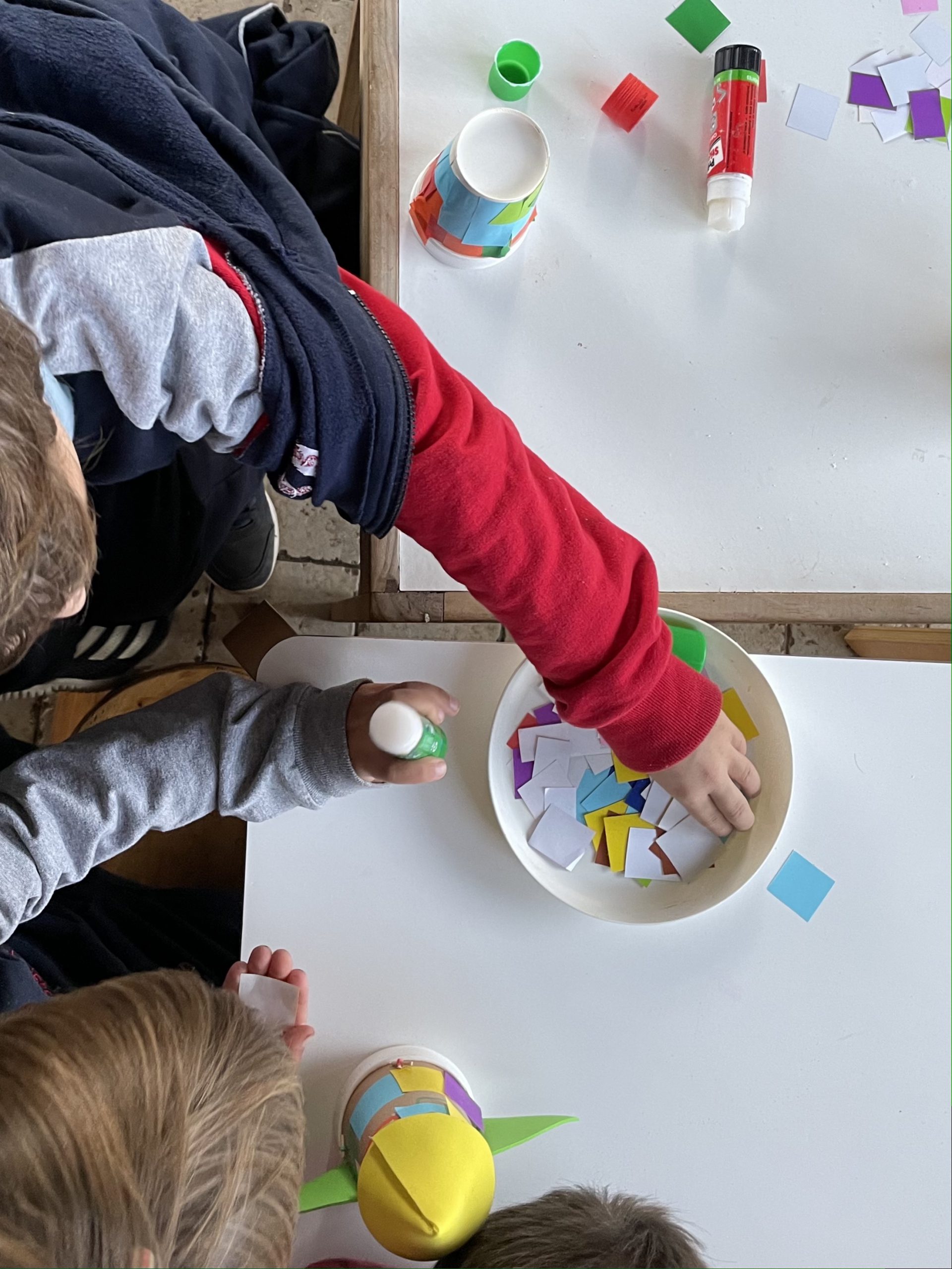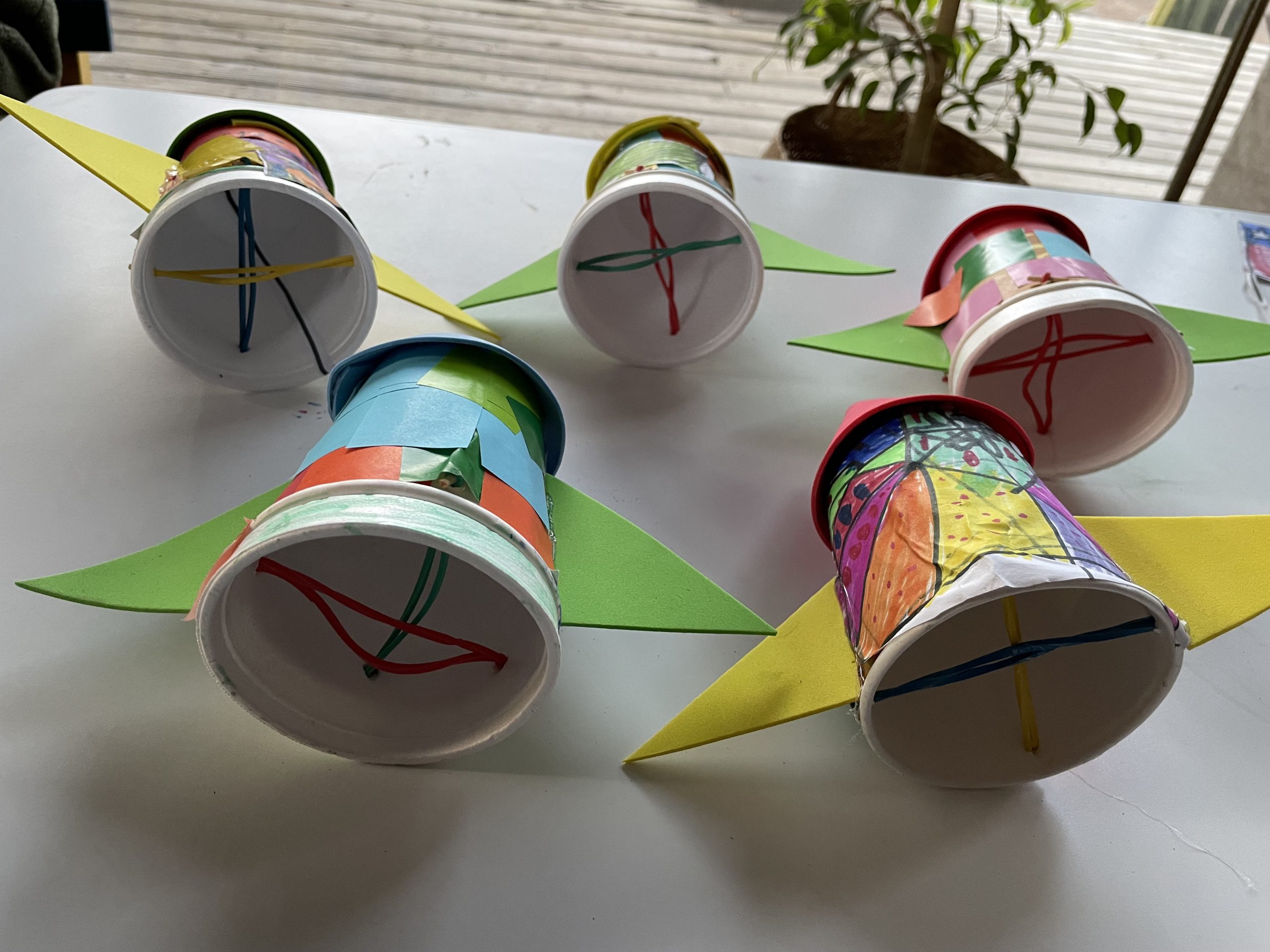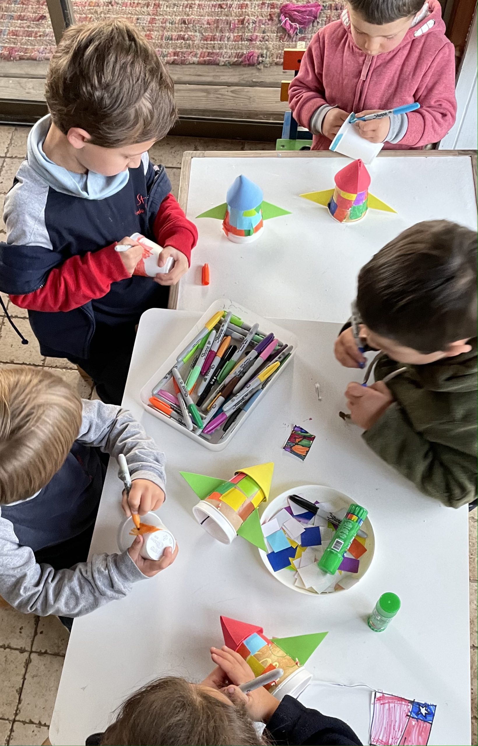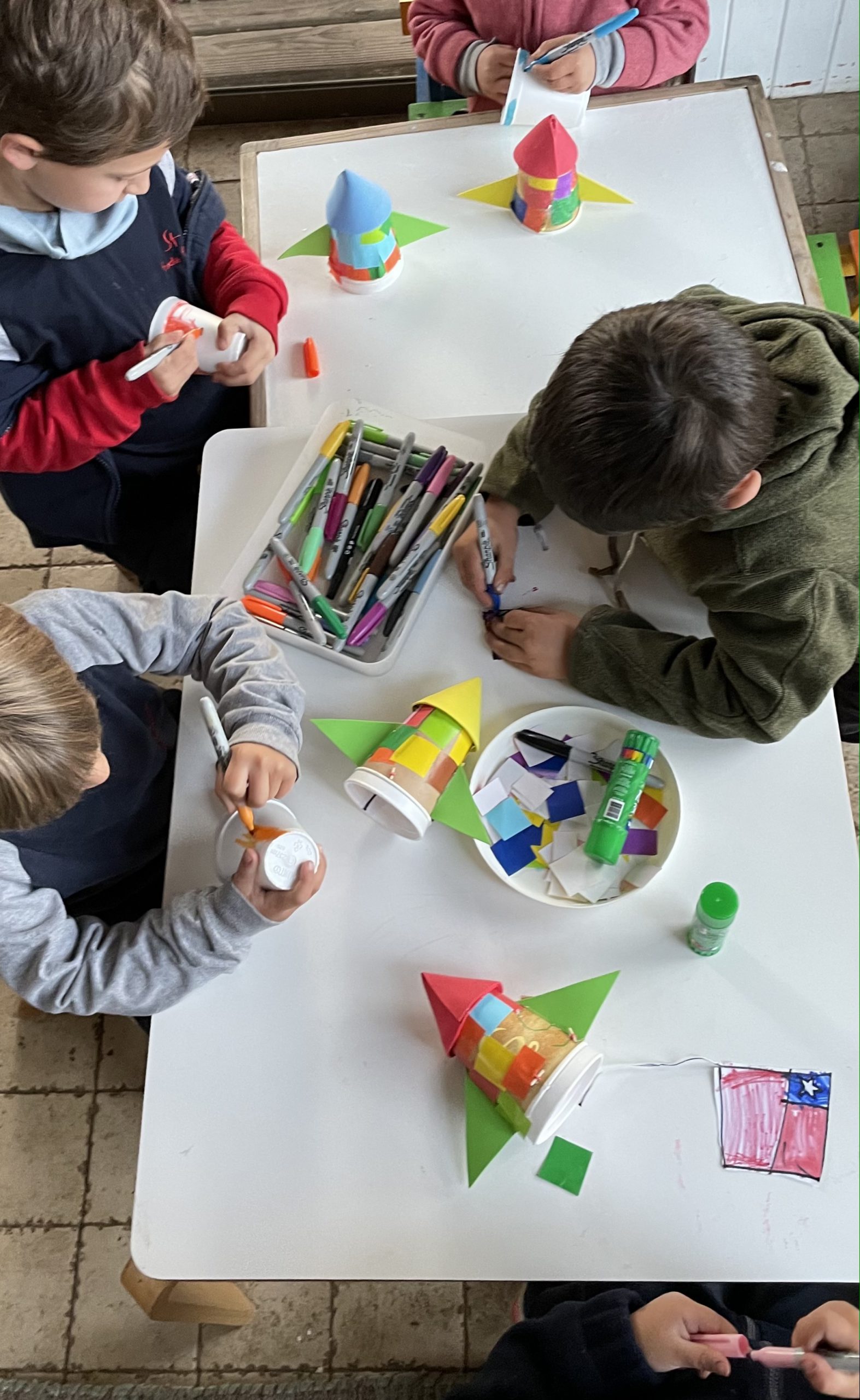 Los niños/as decoran por fuera sus cohetes pegando papel lustre de colores, luego un adulto ayuda pegando las alas y el techo (goma eva) del cohete.