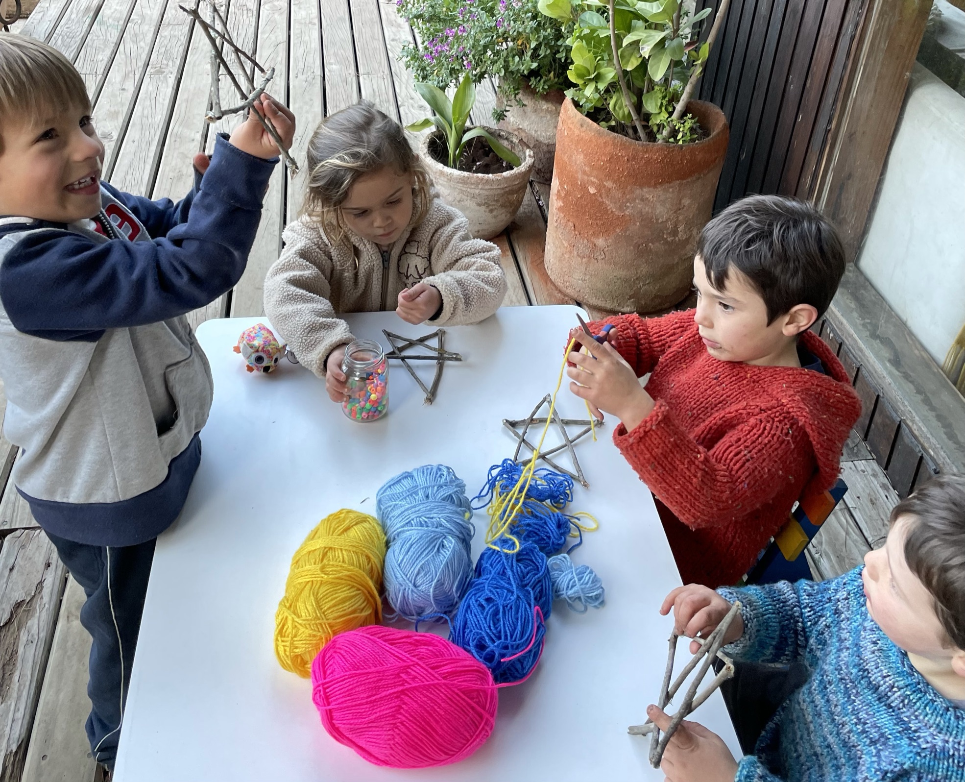 Luego de reflexionar, los invité a hacer estas estrellitas con los palitos que ellos mismos recolectaron en el bosque, unas lanas (cada uno eligió él o los colores que quería para su ⭐️) y las mostacillas de colores… los ayudé pegándolas un poco antes con pistola de silicona.